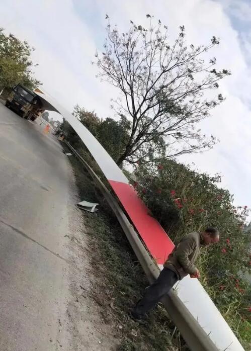 2020年1月9日在廣西賓陽武陵路口拐彎處,某大件運輸公司一輛葉片運輸車在運輸一扇50米風電葉途中,扇葉滑落,值得慶幸的是,只是擋住了整個路口,造成路過的車輛全部從武陵鎮(zhèn)里實施繞行,沒有其它重大損失。