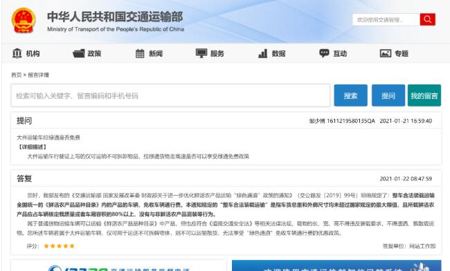 交通運(yùn)輸部官方網(wǎng)站在留言咨詢欄,對(duì)該問題進(jìn)行了答復(fù)。