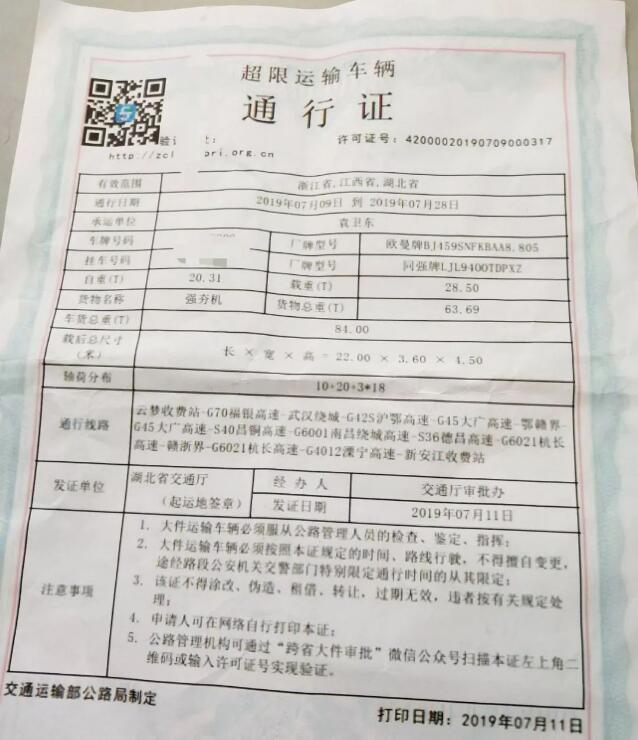 可通過(guò)《超限運(yùn)輸車(chē)輛通行證》左上角提供的查驗(yàn)網(wǎng)址(二維碼)進(jìn)行驗(yàn)證。