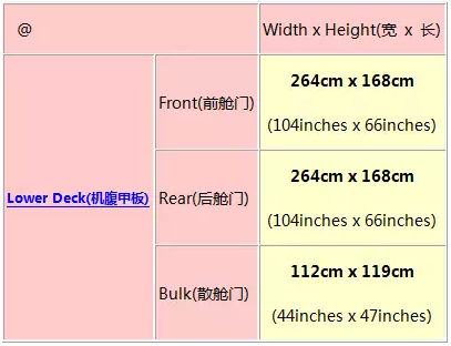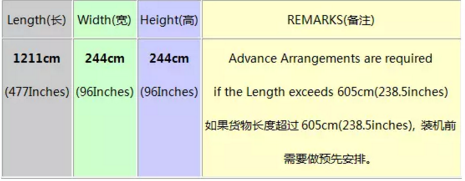 此外注意605cm為20英尺板的長度,如果貨物超過605cm長度,在裝飛機(jī)時(shí)需要做預(yù)先準(zhǔn)備和安排,并從鼻(機(jī)頭)門進(jìn)入飛機(jī)貨艙貨物的一般長度限制為1211cm(等于兩個(gè)20英尺板相加的長度);超過1211cm的貨物不是不能裝入,但限制高度244CM應(yīng)該需要降低,需要做墊板操作才能裝入貨機(jī)。