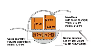 值得注意的是,機(jī)頭開口的實(shí)際尺寸為264cm(寬)x 248cm(高),但考慮到實(shí)際推入貨物到飛機(jī)機(jī)艙時(shí)航空公司都要求貨物兩側(cè)和頂部要和機(jī)艙門框保持合理距離,避免貨物剮蹭機(jī)頭造成安全隱患,并主要類型航空運(yùn)輸集裝器的寬度為244cm,所以從鼻(機(jī)頭)門進(jìn)入飛機(jī)的貨物尺寸高度和寬度被限定為244cm;