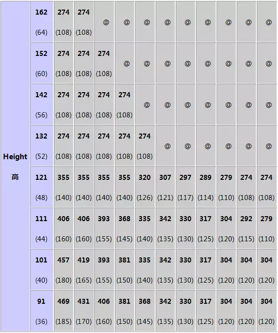 左側(cè)紅色字體藕荷色背景數(shù)據(jù)代表貨物高度,右側(cè)藍(lán)色字體灰色背景數(shù)據(jù)代表貨物長度,底部黑色字體綠色背景數(shù)據(jù)代表貨物寬度,每個(gè)格的上部數(shù)字為厘米(cm),下部數(shù)據(jù)為對(duì)應(yīng)折算的英寸(Inch);