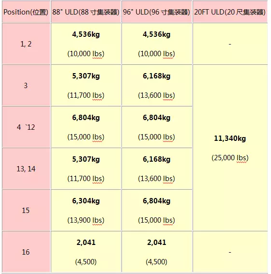2) 從上面的第二張圖片可以看到主貨艙安置集裝器的位置,從1到16排開,下面的表格說明每個(gè)空運(yùn)集裝器可以最多放多重的貨物: